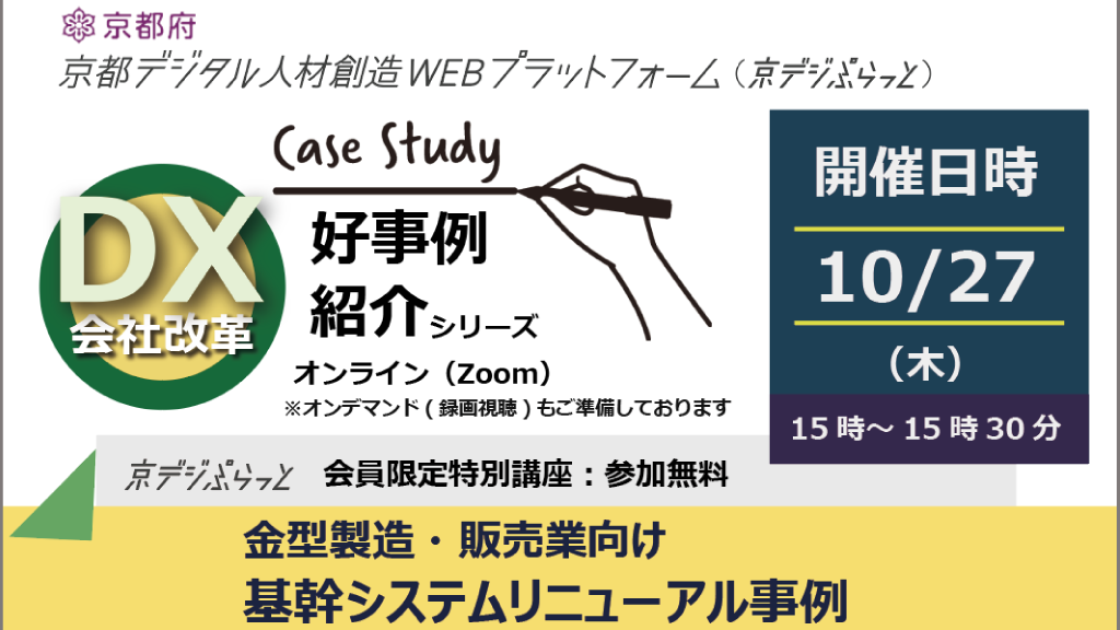 10/27_DX会社改革好事例紹介シリーズ・金型製造・販売業向け基幹システムリニューアル 2022年10月15日 イベント情報カテゴリー特別講座 セミナー内容 経営者層向け、利活用者向け 基幹システム導入・リプレースをお考えの方 業務に合う市販パッケージが見つからない方 具体的にどのように進めるべきか実例を元にご紹介! セミナー詳細 開催日程 2022年10月27日(木) 時間 15:00 ~ 15:30 開催場所 オンライン(Zoom) 講師 バンテック株式会社 チーフエンジニア 三宅 博之 氏 費用 無料 主催者 京都府テレワーク推進センター