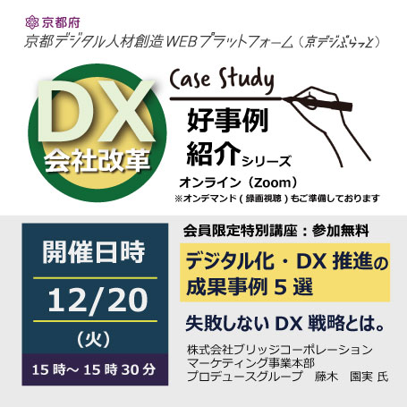 経営者層向け、利活用者向け デジタル化・DX推進の成果事例5選 - 失敗しないDX戦略とは コロナ禍や少子高齢化による人手不足の影響で、多くの企業がデジタルトランスフォーメーション(DX)を推進させる取り組みに注力しています。 さらに、経済産業省の「DXレポート」では企業がDXを推進できない場合のリスクについて警鐘されました。 とはいえ、「どのようにDX推進していけばよいのかわからない」といった方も多いのではないでしょうか? そこで今回は1200社以上の制作実績を誇る株式会社ブリッジコーポレーションがBtoB企業のDX事例をご紹介します。 自社の目指すべきゴールやベストプラクティスの参考としてご活用ください。セミナー詳細