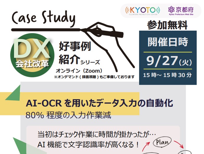 9/27_DX会社改革:好事例紹介シリーズ「AI-OCRを⽤いたデータ⼊⼒の⾃動化~80%程度の⼊⼒作業減」 2022年10月07日 イベント情報カテゴリー特別講座 経営者層向け、利活用者向け AI-OCRを⽤いたデータ⼊⼒の⾃動化~80%程度の⼊⼒作業減 利⽤当初はチェック作業に時間が掛かったが… AI機能で⽂字認識率が⾼くなる! ---講師--- 三谷商事株式会社 情報システム事業部 関西支店 支店長 髙塚 広太郎 氏 学習支援システムの「単発講座」でご視聴いただけます。 当セミナーのフライヤーはコチラ セミナー詳細 開催日程 2022年9月27日(火) 時間 15時~15時30分 開催場所 <開催済>オンライン(Zoom) ※オンデマンド ( 録画視聴 ) 費用 無料 主催者 京都府テレワーク推進センター:京都デジタル人材創造事業