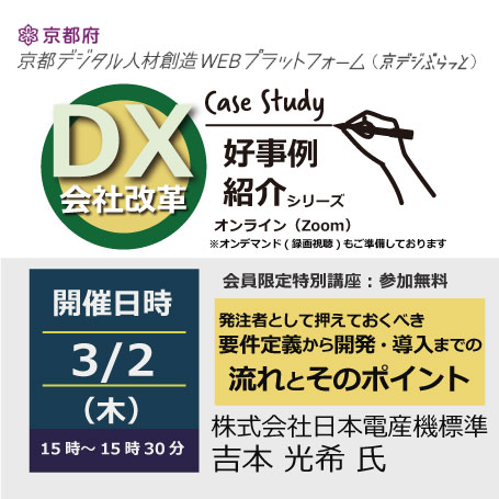 3/2_DX会社改革好事例紹介シリーズ・これからシステム導入・リニューアルされる企業向け:発注者として押えておくべき、要件定義から開発・導入までの流れとそのポイント 2023年02月24日 イベント情報カテゴリー特別講座 セミナー内容 経営者層向け、利活用者向け セミナー詳細 開催日程 2023年3月2日(木) 時間 15:00 ~ 15:30 開催場所 オンライン(Zoom) 講座内容 これからシステム導入・リニューアルされる企業向け:発注者として押えておくべき、要件定義から開発・導入までの流れとそのポイント 講師 株式会社日本電産機標準 吉本 光希 氏 費用 無料 主催者 京都府テレワーク推進センター