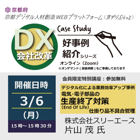 3/6_DX会社改革好事例紹介シリーズ・デジタル化による業務効率アップ事例 (電気・電子部品の生産終了(End Of Life)対策と仕掛り品不具合管理) 2023年02月24日 イベント情報カテゴリー特別講座 セミナー内容 経営者層向け、利活用者向け セミナー詳細 開催日程 2023年3月6日(月) 時間 15:00 ~ 15:30 開催場所 オンライン(Zoom) 講座内容 デジタル化による業務効率アップ事例 (電気・電子部品の生産終了(End Of Life)対策と仕掛り品不具合管理) 講師 株式会社スリーエース 片山 茂 氏 費用 無料 主催者 京都府テレワーク推進センター
