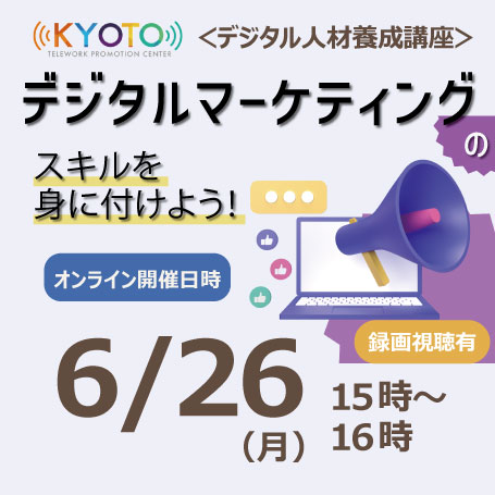 ビジネスで役立つ知識を身に付ける! デジタルマーケティングのスキルを身につければ、今後のキャリアは安泰だと思いませんか?しかし、最初に何から始めればいいのか決めるのは難しいですよね。 そこで、未経験からデジタルマーケターを目指す方々へ、学びはじめる最初の一歩をわかりやすく解説する講座を開催します。 ※お申込みは京デジぷらっと会員登録が必要となります。セミナー詳細