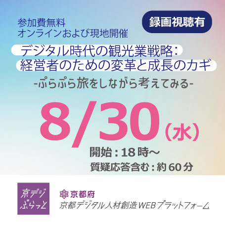 オンライン(Zoom)および現地開催 〒600-8009 京都市下京区四条通室町東入函谷鉾町78番地 京都経済センター3階 KOIN ※後日、動画編集後に京デジぷらっと内で録画視聴可能となります。 ※お申込者へ現地参加をご希望されるか別途ご連絡いたします。