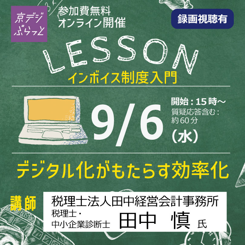 9/6_インボイス制度入門:デジタル化がもたらす効率化 2023年08月18日 イベント情報カテゴリー特別講座 セミナー内容 経営者層、従業員向け 令和5年10月1日から開始される「インボイス制度」 準備はもう済みましたか? 今さら聞けないこと。。。もう一度おさらいしておきませんか? セミナー詳細 開催日程 2023年9月6日(水) 時間 15:00 ~ 16:00 開催場所 オンライン(Zoom) ※後日、動画編集後に京デジぷらっと内で録画視聴可能となります。 講師 税理士法人田中経営会計事務所 税理士・ 中小企業診断士 田中 慎 氏 費用 無料 主催者 京都府テレワーク推進センター