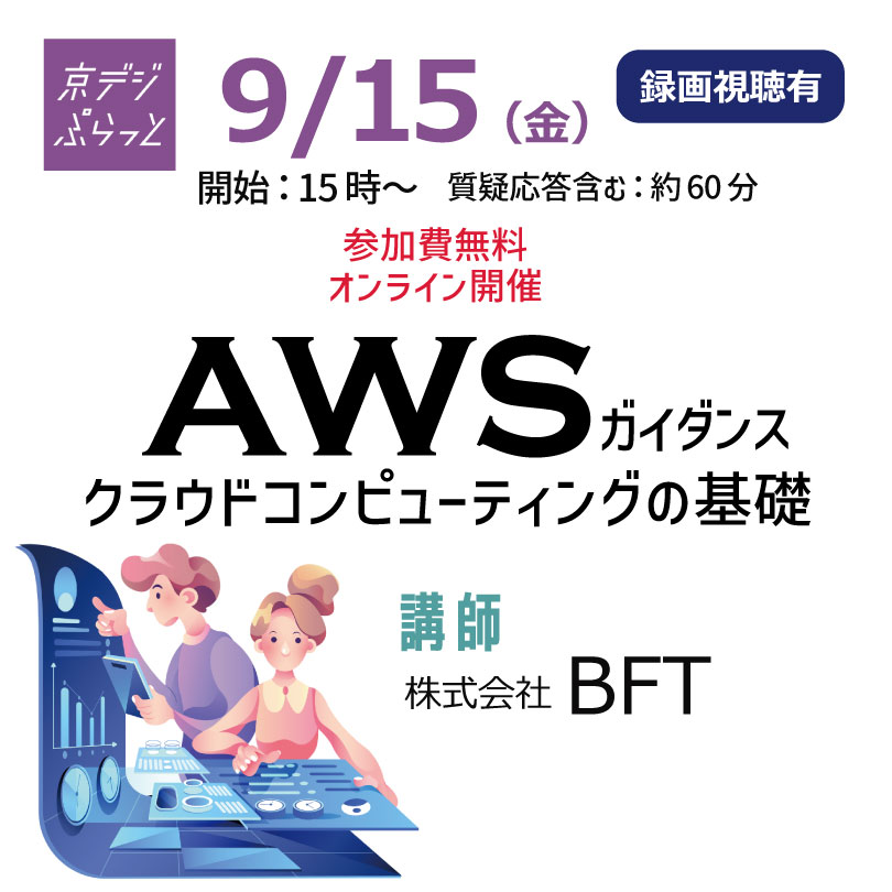 求職者、従業員、経営者層向け 最近テレビのCMなどでもよく見かけるようになった「AWS」。 AWSとはどのようなものか、クラウドの仕組みからサービスの特徴やポイントを簡単に学ぶことができます。 ガイダンス講座となりますので、実際の動作や利用方法を説明する講座ではございません。 とはいえ、まずはどんなものなのか、一度オンラインで視聴してみませんか? お仕事を探していらっしゃる方には、別途9/19に20名限定で現地開催のAWS研修ワークショップもご用意しております。 ※AWS(Amazon Web Services)は、アマゾンが提供するクラウドコンピューティングプラットフォームです。