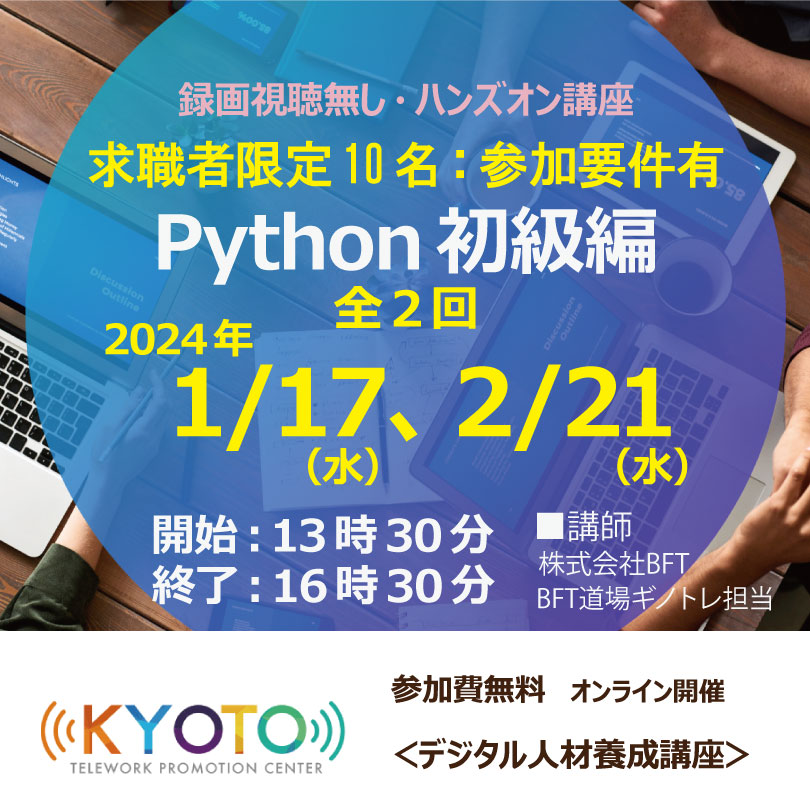 [申込受付終了]1/17、2/21_申込締切2024年1月4日(木)正午_求職者限定10名:Python初級編 全2回:デジタル人材養成講座