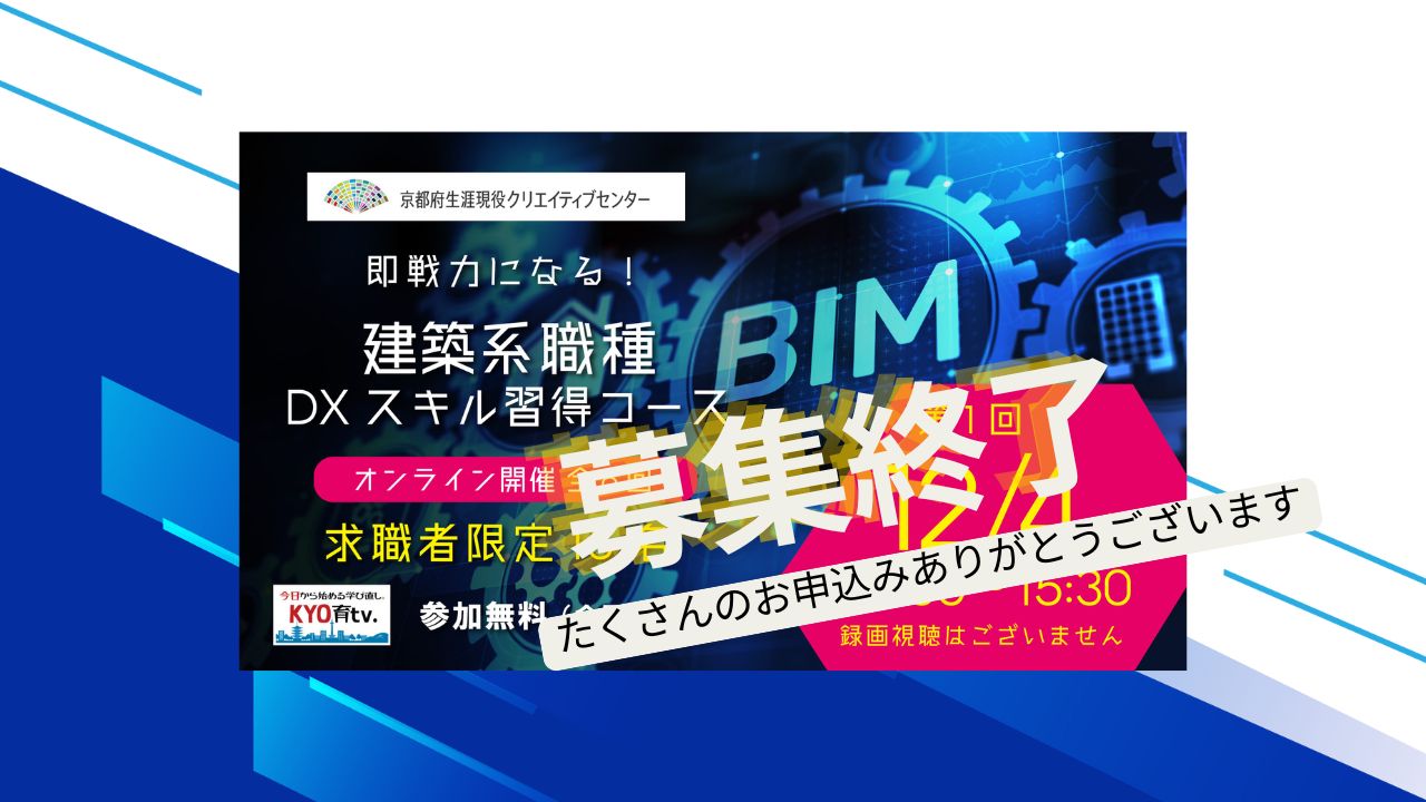 この度、KYO育tv.では、建築系職種のDXスキルとして今後求められる「BIM」の基礎力をつけ、現場での応用力を養成するための、求職中の方におすすめコースをご用意しました!