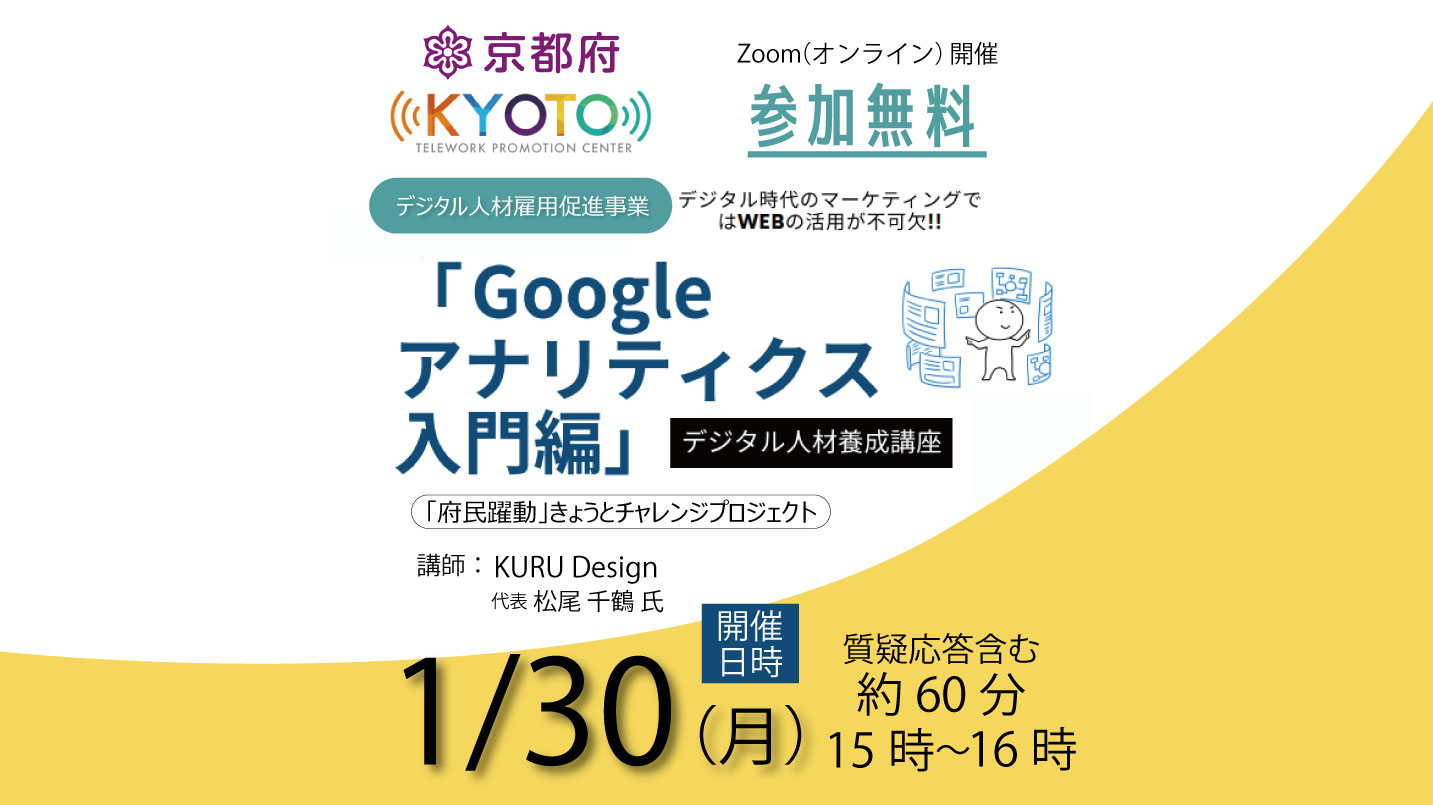 【講座概要】 ◆実施内容:入門編として基礎の基礎を講師が分かりやすく解説 ◆開催日程:令和5年1月30日(木)15時~16時 ◆開催方法:オンライン(Zoom)※開催後の録画視聴もご用意いたします。 ※お申込みは終了いたしました。 【申込に関する問い合わせ】 京都府テレワーク推進センター デジタル人材雇用促進事業 担当 芳井・渡辺 070-1421-1903/平日9時~17時 Mail:digital-jinzai@kyoto-telework.jp