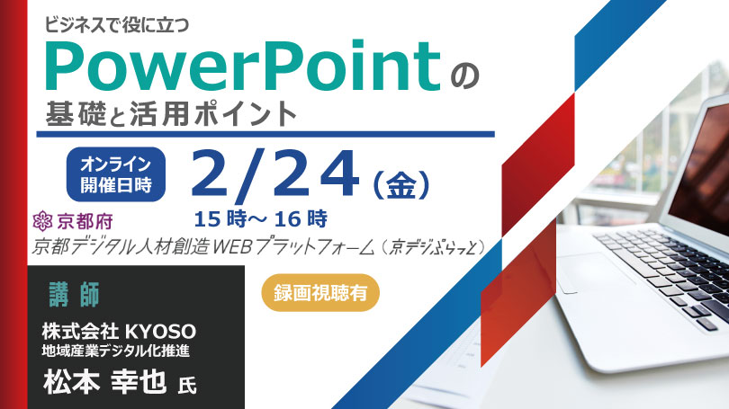 2/24オンライン開催_「ビジネスで役に立つPower Pointの基礎と活用ポイント」京デジぷらっと特別講座 2023年02月04日 セミナー内容 経営者層向け、利活用者向け、求職者向け セミナー詳細 開催日程 2023年2月24日(金) 時間 15:00 ~ 16:00 開催場所 オンライン(Zoom) ※後日、動画編集後に京デジぷらっと内で録画視聴可能となります。 講師 株式会社KYOSO 地域産業デジタル化推進 松本 幸也 氏 費用 無料 主催者 京都府テレワーク推進センター