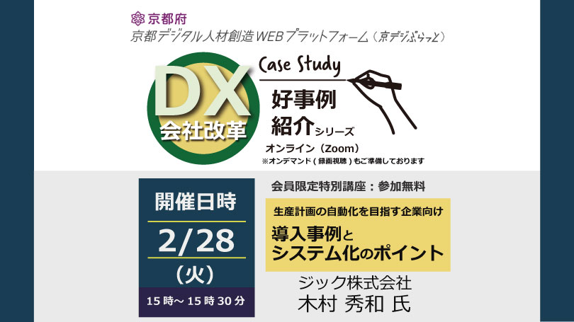 2/28オンライン開催_DX会社改革好事例紹介シリーズ・生産計画の自動化を目指す企業向け:導入事例とシステム化のポイント 2023年02月16日 セミナー内容 経営者層向け、利活用者向け セミナー詳細 開催日程 2023年2月28日(火) 時間 15:00 ~ 15:30 開催場所 オンライン(Zoom) 講座内容 第1章 生産活動と生産計画 第2章 自動化するために必要となる情報の整理 第3章 生産計画を自動立案するために 第4章 生産計画と現場の一体管理<現場への見える化> 講師 ジック株式会社 木村 秀和 氏 費用 無料 主催者 京都府テレワーク推進センター