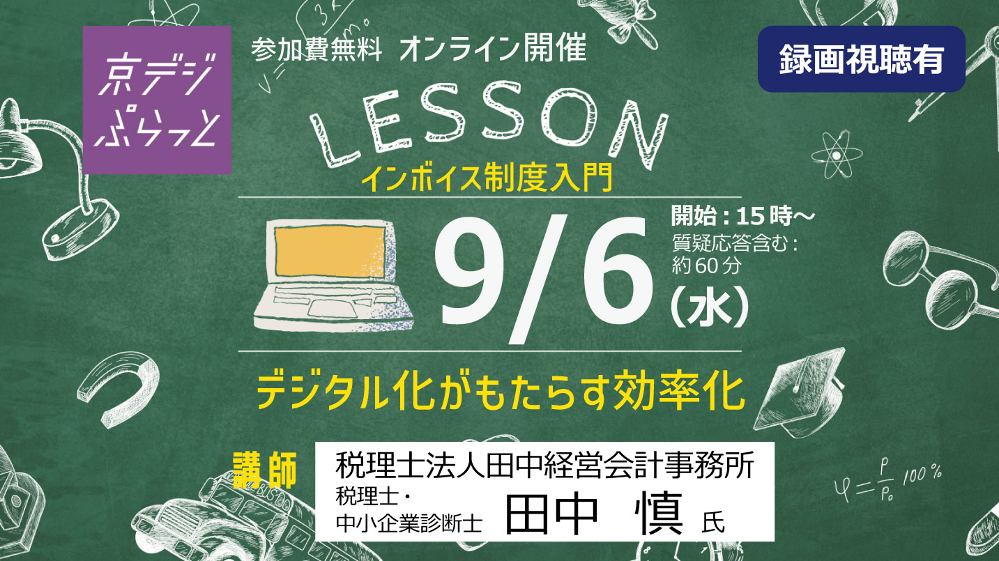 9/6_インボイス制度入門:デジタル化がもたらす効率化 2023年08月18日 セミナー内容 経営者層、従業員向け 令和5年10月1日から開始される「インボイス制度」 準備はもう済みましたか? 今さら聞けないこと。。。もう一度おさらいしておきませんか? セミナー詳細 開催日程 2023年9月6日(水) 時間 15:00 ~ 16:00 開催場所 オンライン(Zoom) ※後日、動画編集後に京デジぷらっと内で録画視聴可能となります。 講師 税理士法人田中経営会計事務所 税理士・ 中小企業診断士 田中 慎 氏 費用 無料 主催者 京都府テレワーク推進センター