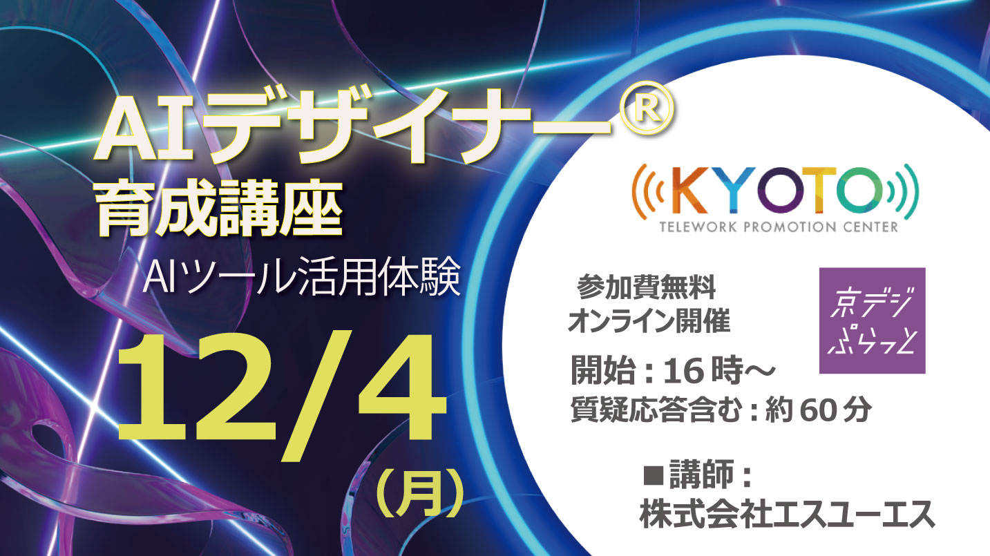 画像検査や計画の最適化をはじめ、データ分析、在庫管理、コスト管理、利益予 測などの作業に関する課題を、AI で解決する手段、手法を学ぶことができる講座「AIデザイナー🄬育成講座」のご紹介。 AIデザイナー🄬認定のチャンス! ①京デジぷらっとの「AIデザイナー🄬育成講座」動画視聴(6本)約5時間 (ログイン後「コースを探す」から「デジタル基礎人材養成コース(初級)ステップ3:資格に挑戦」を選択していただくと表示されます) ②各動画の理解度テストを受講(全動画分合わせて20問程度) ③12/19実施の求職者限定10名の講座で、AIのプロフェッショナルよりコンサルティングをご提供 ※③はノーコードツールを使って実際にAIを作るオンラインの集合研修です(12/19講座お申込みいただき、①②の受講者の中から参加者を決定いたします) ※動画の視聴、理解度テストの受講が終わりましたら12/12(火)頃を目途に運営事務局よりご連絡をさせていただきます。 短期集中未経験でも1週間で実践的なAIが作れる! ※認定は一定の基準を満たした求職者の方が対象となります。 今回は上記の講座ガイダンスとして、AIツールオンラインでの体験会を行います。 京デジぷらっとの動画に関する質問等もお気軽にしていただけます。 ぜひこの機会にAIデザイナー🄬認定を目指して学んでみませんか?参加無料です! 京都デジタルxバーチャル就職フェアの会場「Galimo」での開催となります。 就活中の方も、これからを見据えて新しいスキルを模索中の方もぜひ「DX時代の即戦力人材」について一緒に学んでみませんか? ※バーチャル会場へのログインが必要になります。 操作方法などはお申込みの方へ別途ご案内いたします。