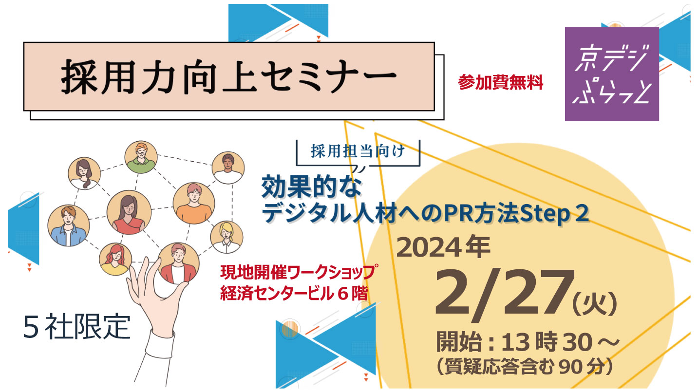 <5社限定ワークショップ>採用担当者向け! 苦戦する企業が多い「デジタル人材」を採用するための、”採用広報”とは? 優秀なエンジニアに選ばれる企業になるためのポイントを、わかりやすく講師が解説します。 ★こんな企業の採用・広報でお悩みの方に★ ・デジタル人材の採用が進まなくて困っている ・求人を出しているのに応募がこない、会いたい人に出会えない ・もっと広報しなきゃと思うものの、何から手をつければいいか分からない 採用広報の基本から、現在の採用マーケット情報、そして実際に採用広報を成功させるポイントについて理解を深めていただきます。 後半では実践にも踏み込んだ内容もお伝えする予定です。 ※2/6にオンライン開催された内容を元に、2/27に現地(経済センタービル6階)開催にてワークショップとして5社限定で開催!セミナー詳細