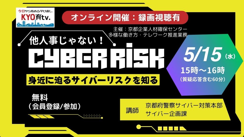 京都府警本部生活安全部サイバー企画課にご協力いただき、身近に迫るサイバーリスクを知る講座をご用意しました。講義の後半では実際のウイルスがどんなものかを見ることができます。録画視聴は前半のみですので、ぜひオンラインでご参加ください。セミナー詳細