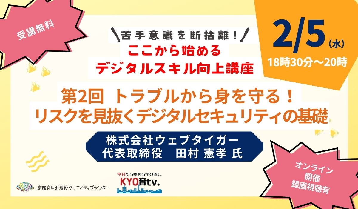 トラブルから身を守る!リスクを見抜くデジタルセキュリティの基礎 現代のライフスタイルにおいて、誰もが使うデジタルツール。 日々進化するサイバー攻撃やデジタルリスクから身を守るためには、基本的なデジタルセキュリティ対策を理解し、実践することが欠かせません。 本講座では、デジタルセキュリティの基本知識と重要性を学び、実際の事例をもとにどのようなリスクが潜んでいるのかを理解し、脅威の見抜き方やリスク管理のテクニックを紹介します。さらに具体的なセキュリティ対策やポリシー策定の重要性についても学びます。 「リスクを見抜ける力」を身につけ、デジタルの世界で安心して暮らすための第一歩を踏み出しましょう。 ~苦手意識を断捨離!ここから始めるデジタルスキル向上講座(全4回)~ 【第1回】1月22日(水)「AIは怖くない!?まだ間に合う初めてのChatGPT」はこちら 【第3回】2月19日(水)「Excel&Google Sheetsではじめる!ゼロから学ぶデータ分析入門」はこちら 【第4回】3月5日(水)「あなたも今日からクリエイター!Canva & Figmaで学ぶ簡単WEBデザイン」はこちらセミナー詳細
