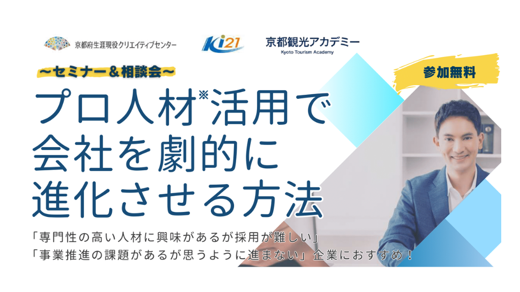京都府生涯現役クリエイティブセンターでは、京都産業21、京都観光アカデミーと連携して、人材不足でお悩みの企業を対象に、