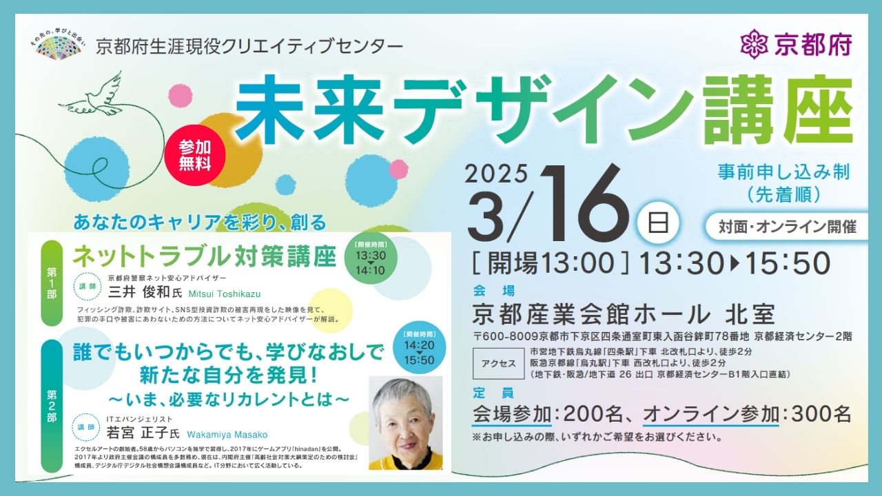 「未来デザイン講座」(第1部:ネットトラブル対策講座、第2部ITエバンジェリスト若宮正子氏による講演)を3月16日(日)に開催いたしました。